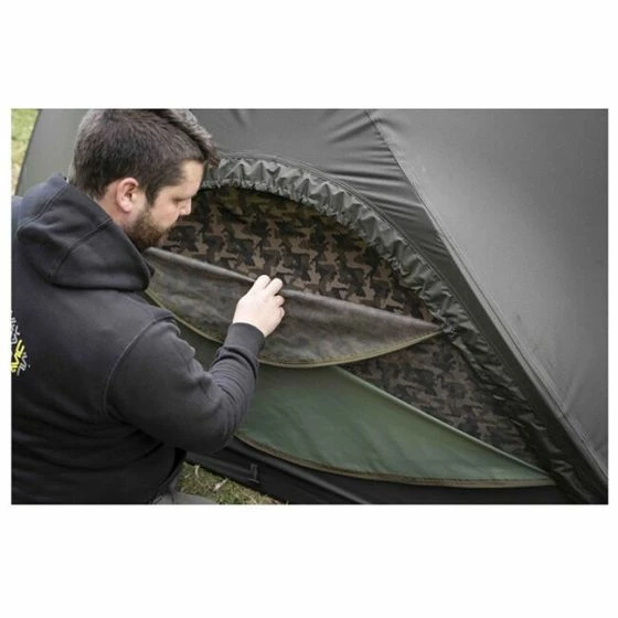 The rear of the brolly features a huge zip down window with camo mesh panel. The camo mesh panel can also be zipped down to reveal the dual layer system which also features a zip panel to allow for maximum airflow.