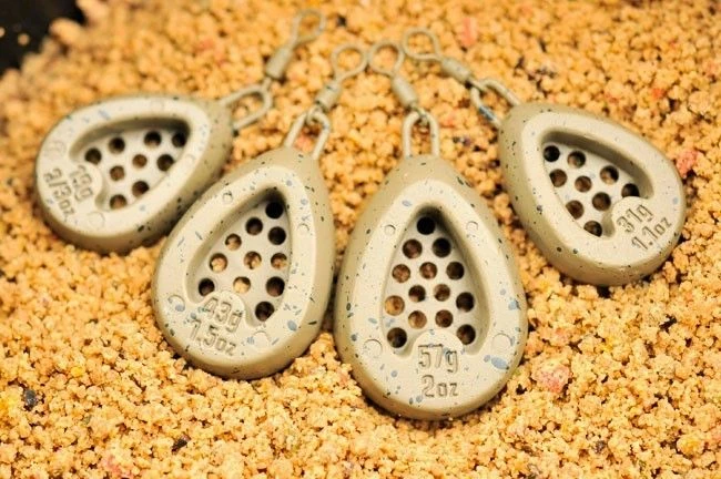 Available in 2/3oz, 1.1oz, 1.5oz and 2oz, they’re the perfect balance between a feeder and straight lead, depositing an enticing trail of pellets, Goo, groundbait, liquidised meat/bread or paste in your swim when the bomb impacts the water at ranges of up to 80m.