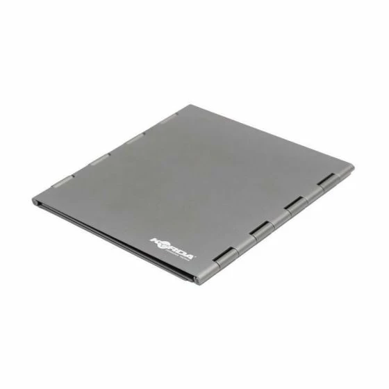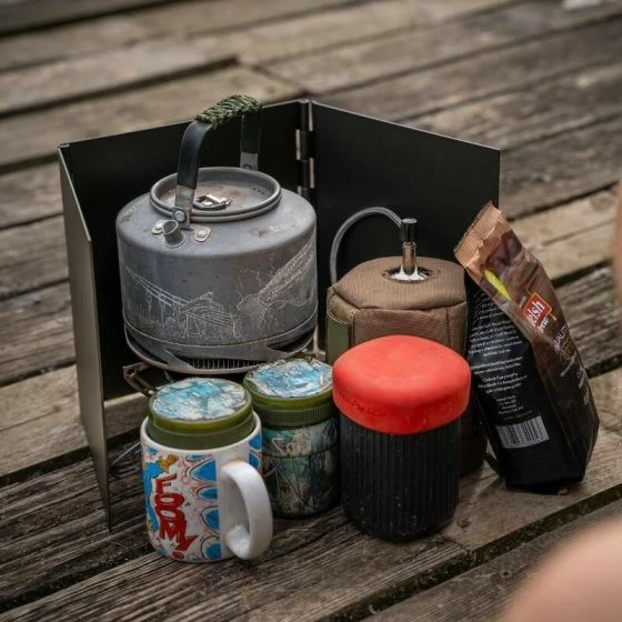 Korda’s large windshield, essentially a large folding screen that opens up to surround your stove. A really useful item that improves the performance of your stove on windy days. Everything from cooking food to making brews is quicker and easier, and will use less fuel too.