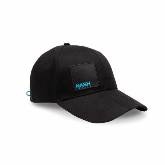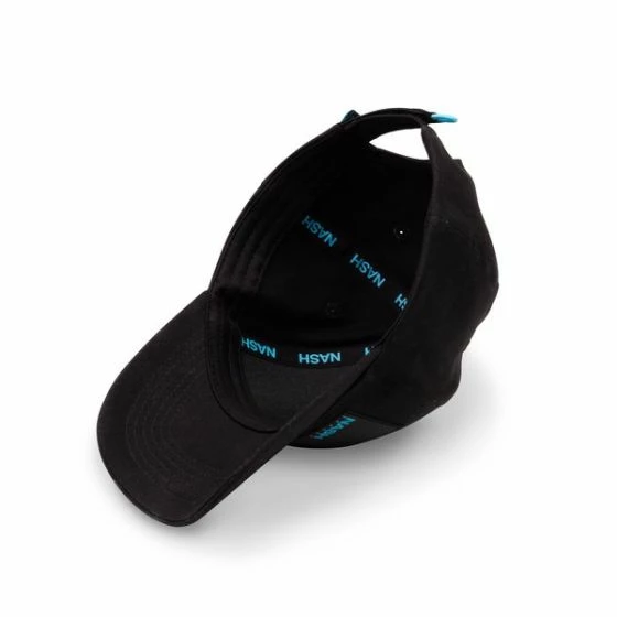 Two styles of classic baseball cap with Velcro adjustment, silicone screen printed logos and neat internal Nash trim. The Green design features an opposing black peak with black button and tab trim detail. The Black design features a cyan blue Nash logo with matching blue tab puller for the Velcro adjustment.