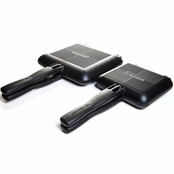 The best just got even better!! Super compact, lightweight design featuring a unique detachable hinge system that allows the pans to be used independently if required, one-touch removable handles that securely store at the back of the utensil tray that comes included with every toaster and a fluoropolymer non-stick coating that is second to none, the new RidgeMonkey Connect Compact Sandwich Toasters raise the cookware bar once again!!