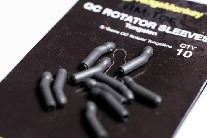 A semi-stiff tungsten impregnated sleeve designed to be used with the RM-Tec QC Rotator Swivel, featuring a pronounced bend to kick your hook over at precisely the right angle for maximum rig efficiency. Covers the rounded Quick Change elbow of the QC Rotator Swivel and is a critical component to ensure your rig remains neat, tidy and secure. This super heavy tungsten version provides added weight to the rig, lessening the need for a large blob of putty and incorporates an integral hook ring stop to prevent your mini hook swivel from jamming on the sleeve allowing it to reset automatically if the rig is rejected. 10 per pack.