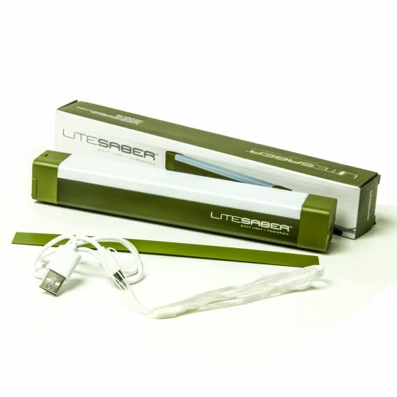 The LITESABER is a bivvy light and power pack in one, sleek unit. The lithium battery delivers long life, 6 hours PLUS on full 400 lumen light mode and enough power to charge a typical smart phone, yet it weights a fraction of the weight of standard battery lights and power packs. The ABS and aluminum body delivers a durable yet featherweight unit with the magnetic, hook or cord hanging options.