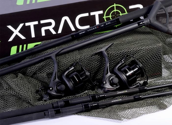 Another brand new innovation from Sonik is the introduction of four new XTRACTOR 2 rod carp kits. Available now, the new kits comprise of 2 x XTRACTOR slim shrink retractable-butt rods in either 9’ 2.75lb, 3lb or 10’ 3.25lb, 3.5lb versions, together with 2 x VADERX 5000 or 6000 FS size reels, (5000 with the 9’ and the 6000 with the 10’ models), plus a VADERX, 2 piece 42″ landing net, all in one box.